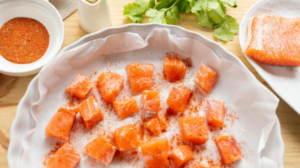 - Cut the salmon into small, bite-sized cubes and pat them dry with a paper towel.